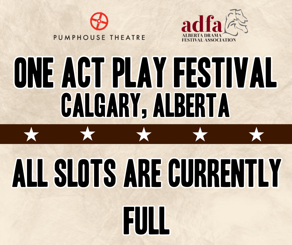 The Pumphouse Theatre has presented the Calgary Region One-Act Play Festival with the Alberta Drama Festival Association for over 30 years and we are excited to do so again! Registration for 12 spots will open on a first-come, first serve basis beginning September 17th, 2026 at 12 pm. The Festival is scheduled to be held April 1 – 4, 2026 in the Victor Mitchell Theatre.