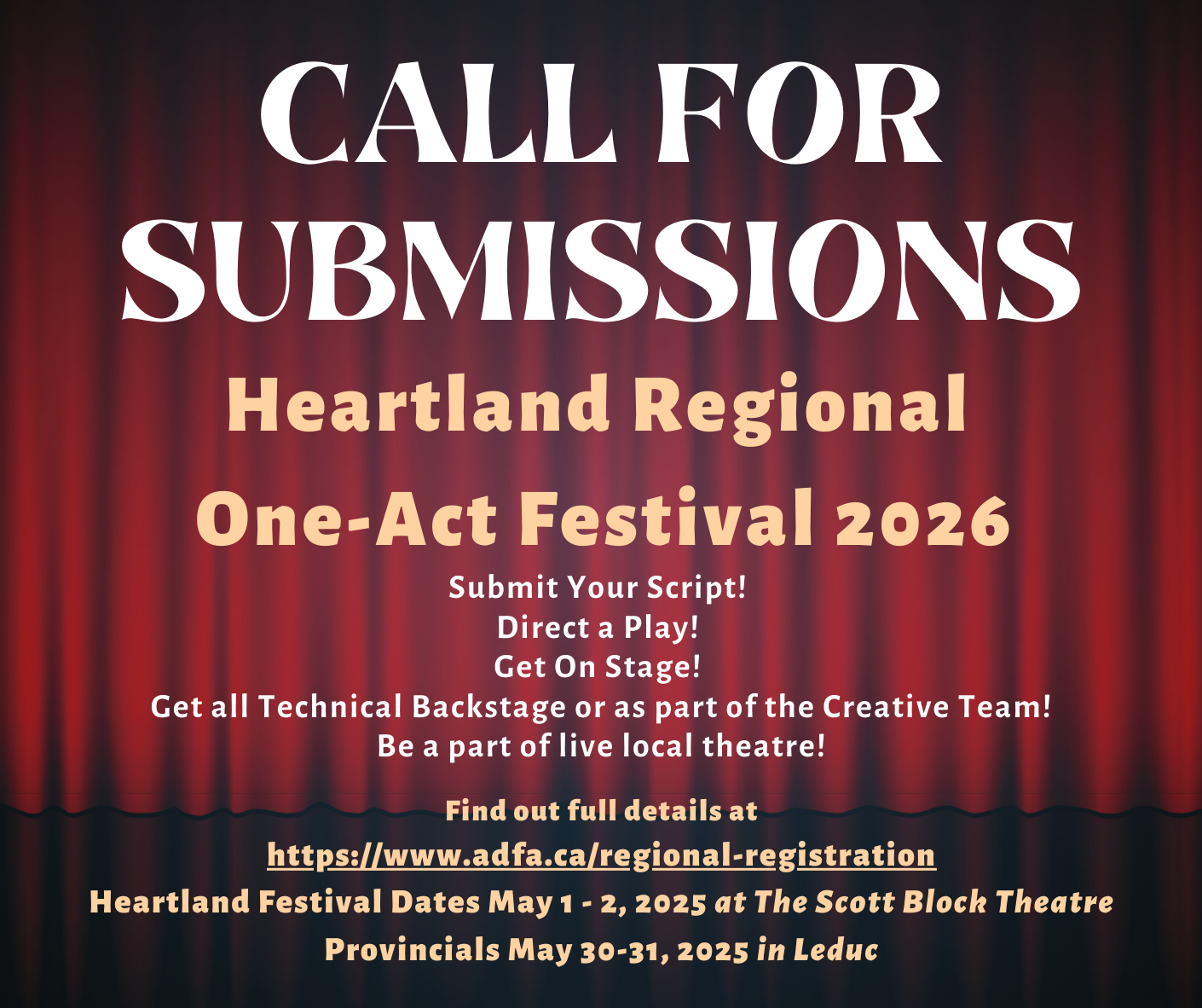 Participants must be willing and able to travel to Provincials May 30-31, 2026 in Leduc if selected as Outstanding Production. Travel costs are reimbursed by the Alberta Drama Festival Association.